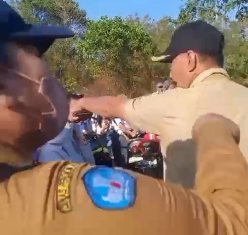 Dalam video nampak terlihat seorang pria menggunakan topi hitam seragam aparatur sipil negara (ASN) mendatangi lalu membentak puluhan pelajar dan guru tersebut. Namun bentakan itu dibalas dengan sorakan oleh puluhan siswa.