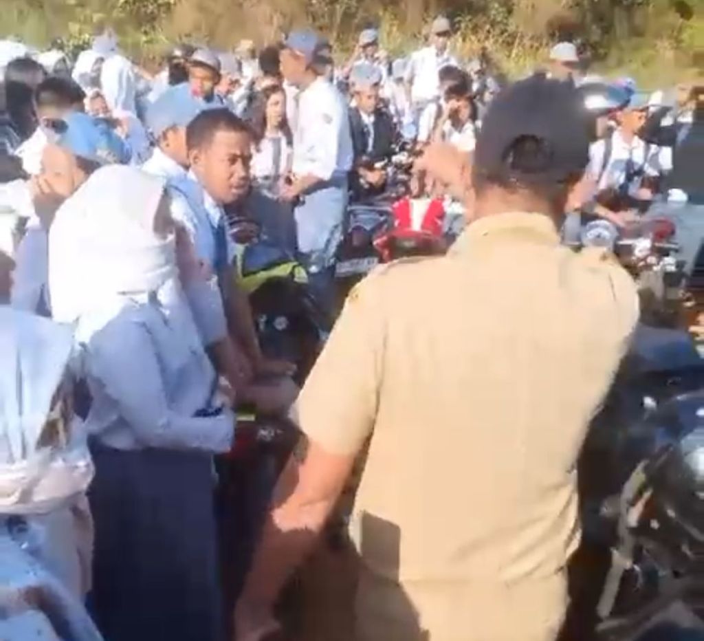 “Jangan kasih begitu. Ini jalan umum. Apa gunanya ibu merekam begitu, kalian tidak mau diatur dengan Pemerintah ka,” kata pria yang menggunakan seragam ASN itu dengan nada membentak sembari menunjuk ke arah pelajar.
