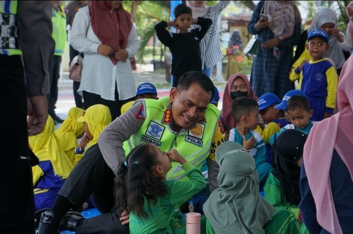 Terlihat di lokasi kegiatan, Dirlantas Polda Aceh Kombes M Iqbal Alqudusy menyapa dan bermain bersama anak-anak sambil memberikan edukasi dan tata cara berlalu lintas kepada anak -anak.
